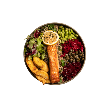 Salmon, Quinoa, Beetroot, Capers, Pea, Greens, Sesame, Black Cumin, Purple Cabbage, Potatoes