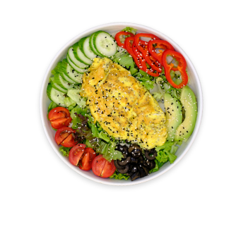 Cherry Tomato, Greens, Cucumber, Sesame, Black Cumin, Olive, Red Pepper, Avocado, Cottage Cheese, Olive Oil, Egg