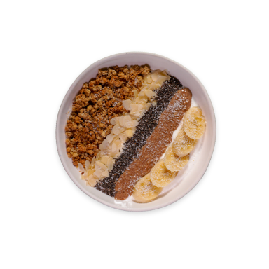 Strained Yogurt, Acai Powder, Granola, Honey, Peanut Butter, Berries, Chia Seeds, Flax Seeds, Shredded Coconut