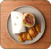 Lavash, Shredded Beef, Lettuce, Roasted Pepper, Pickled Onion, Mexican Beans, Mustard Sauce
