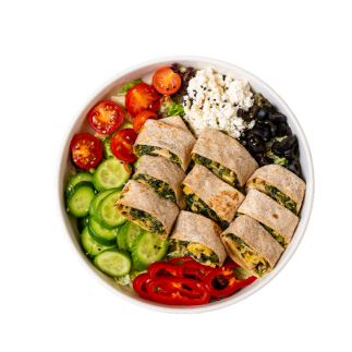 Lavash, Cottage Cheese, Olives, Egg, Seasonal Greens, Tomato, Bell Pepper, Cucumber, Sesame, Black Cumin Seeds