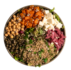 Rakula-Karışık Akdeniz, Bal Kabağı, Kinoa, Ay Çekirdeği, Feta Peynir, Soğan Turşusu, Kapari, Nohut