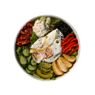 Avocado, Potato, Cherry Tomato, Greens, Cucumber, Sesame, Black Cumin, Olive, Red Pepper, Cottage Cheese, Fried or Boiled Egg