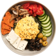Sautéed Spinach topped with Egg, Strained Cheese, Olives, Tomato, Cucumber, Pepper, Mushroom, Keto Cracker