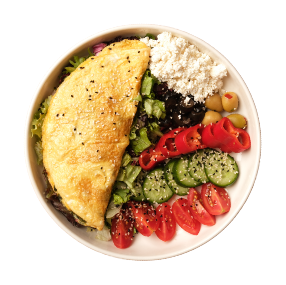 Cherry Tomato, Greens, Cucumber, Sesame, Black Cumin, Olive, Red Pepper, Avocado, Cottage Cheese, Olive Oil, Egg
