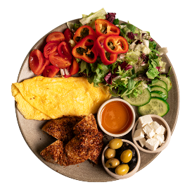 Cherry Tomato, Greens, Cucumber, Sesame, Black Cumin, Olive, Red Pepper, Spinach, Olive Oil, Egg, Curd Cheese
