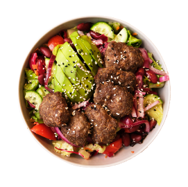 Greens, Meatballs, Avocado, Red Cabbage, Carrot, Tomato, Cucumber, Mexican Beans, Pickled Onion with Honey Mustard